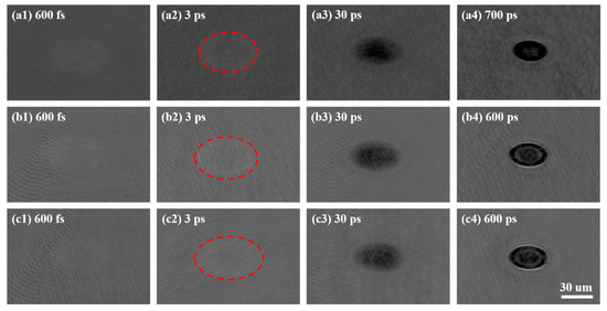 According to the analysis of the XRD patterns, the as-grown, crystalline FCC state, and HCP state films were selected to study the ultrafast dynamics of different phase states, which were the as-deposited films and the films annealed at 250 °C and 350 °C for 30 min, respectively. To obtain a strong signal-to-noise ratio, the laser fluence of 0.045 J/cm2 was used to carry out the pump–probe experiments, which is more than the ablation threshold of GST films. The transient non-equilibrium states of different phase states GST films excited by a single femtosecond laser pulse are shown in Figure 4. It can be found that the reflectivity of these films changes with the delay times after the laser irradiation. The areas irradiated by the laser beam of different phase states films are a little obscure and bright at the beginning—sub-picosecond—and form elliptical shapes, because the pump pulse is focused on the sample at an angle of 45°. Then, the center of the areas becomes dark, and the size of the dark regions grows bigger from 3 ps to 30 ps for the three kinds of films. Among different phase states GST films, the excited zone of the crystalline HCP structure sample is the biggest, while that of the amorphous GST is the smallest at the delay time of 30 ps, shown in the red circles in Figure 4. It can be indicated the electron in crystalline HCP structure GST can be excited the most easily, while that in the amorphous state is excited a little more difficultly, which will be studied in the later analysis. As the delay time increases, the center of the area is lighter than the surrounding. The Newton rings emerge at the delay times of 700 ps, 600 ps, and 600 ps for the amorphous, crystalline FCC state, and HCP state films, respectively, which is caused by the constructive and destructive interference of the light reflected from the surface with the light reflected from the layer interface, induced by the formation of a thin layer on the surface as induced by the laser beam [34]. In addition, the background intensities of the shadowgraph images for the amorphous GST films are different from those for the crystalline FCC state and HCP state films, while the background intensities of the images are almost the same for the crystalline FCC state and HCP state films.