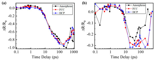 Because the laser fluence used in the pump–probe experiments is more than the ablation threshold of these films, and the intensity of the laser beam yields a Gaussian distribution, the normalized reflectivity can be divided into two zones to investigate the ultrafast dynamics of different phase states GST films. One zone is irradiated by the relatively high fluence of a laser pulse, and the center of the elliptical area is selected to present the reflectivity of this zone. The other zone is excited by the relatively low fluence of a laser pulse. The position of this zone changes with the delay time at the beginning when the laser beam irradiates the material, and it is the surrounding of the excited region on the films. The normalized reflectivity of two zones is calculated based on Equation (1) and shown in Figure 6. The reflectivity of the area irradiated by a relatively high laser fluence experiences an increase when excited, and there is a maximum value at the delay time of about 600 fs for these films. The reflectivity of amorphous GST films rises the fastest, while that of the crystalline HCP structure films grows the most slowly during this period, as shown in Figure 6a. Although the reflectivity of the area irradiated by a relatively low laser fluence also increases at first after being excited, the curves reach the maximum at around 1 ps, as shown in Figure 6b. The maximum reflectivity is in the curve of the crystalline HCP structure films, while the minimum is in the curve of the amorphous films excited by a relatively low laser fluence. This is because when the femtosecond laser is focused on the GST films, the free carrier is excited first, and then the energy of the laser transfers from the electron to the lattice. Due to annealing, the structure of bonding changes for different phase states [35], and the band gap of the GST films decreases [30]. When a laser pulse with a relatively low fluence is focused on the samples, the electron of the crystalline HCP structure films with a relatively low band gap is easy to excite. Thus, the reflectivity of the irradiated area increases fast, and there is a maximum reflectivity for the crystalline HCP structure films among these samples excited by the same fluence of the laser beam. However, the electron of the amorphous GST is harder to excite due to the relatively high band gap for different films. Similarly, the reflectivity grows slowly, and there is a minimum value among these samples irradiated by the same laser fluence, as shown in Figure 6b, though there are some fluctuations due to the low signal-to-noise ratio. This is why the size of excited zones for the crystalline HCP structure films are the biggest in the circle in Figure 4. As the fluence of the laser pulse increases, the electron of the crystalline HCP structure films with a low band gap will be excited faster and faster. Therefore, the maximum reflectivity decreases, and there is a minimum reflectivity for the crystalline HCP structure films among these samples. Likewise, there is a maximum reflectivity for the amorphous state films with a relatively high band gap among these films, as shown in Figure 6a. Because of the decrease in the band gap after GST films annealed, the electron becomes easier to be excited by the femtosecond laser. When the intensity of the electron reaches the threshold, the films will be ablated [36]. Thus, the ablation threshold of the crystalline HCP structure films is the lowest, and that of the amorphous GST films is the biggest among these samples. It is consistent with the results above. When the delay time increases from ~600 fs to ~200 ps, the reflectivity of the center of the irradiated areas decreases for all the films. That of the crystalline HCP structure films drops a little faster than that of the crystalline FCC structure films, and that of the amorphous GST films declines the most slowly among them. This process represents the energy transfers from the electron to the lattice of the films. This causes a temperature increase in the lattice, which can result in crystallization, and even ablation of the material. When the delay time continues increasing, the reflectivity of the zones irradiated by the relatively high laser fluence returns to growing, then fluctuates due to melting and ablation for all the samples as shown in Figure 6a. Likewise, when a relatively low fluence of laser pulse irradiates the films, the reflectivity falls from the delay time of ~1 ps to ~10 ps. After that, it fluctuates, and this is probably because of the heat transfer from the center, which is irradiated by a relatively high laser fluence, resulting in a temperature difference.