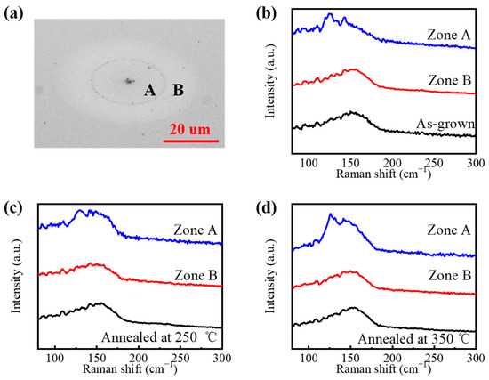 The crystallization evolution induced by a femtosecond laser beam pulse for different phase state GST films are also investigated on two zones. The final structure of crystalline FCC structure film after pump–probe experiments, as an example, was measured using an optical microscope (Olympus Inc., BX51, Melville, NY, USA), and the optical images are shown in Figure 7a. Zone A is irradiated by the relatively high laser fluence in the center of the structure, where the materials are removed by the laser beam, and a dent is formed. However, the films are thick enough for the laser beam to ablate, and there are still GST materials in the dent. Zone B is irradiated by the relatively low laser fluence at the surrounding of the structure, where the reflectivity changes compared with that of the original films. The Raman spectrum of the original films, Zone A, and Zone B of different phase states films are shown in Figure 7b–d. After the laser beam irradiation, the relative intensity of Peak A to Peak B drops from about 1.4 to about 1.2 in the Raman spectrum of Zone B on the amorphous GST films, and it continues falling from about 1.25 to around 1.15 in Zone B on the crystalline FCC structure films. It is indicated that an amorphous GST film can be crystallized to the FCC structure by a femtosecond laser pulse. This is because the electron will be excited by a femtosecond laser, and have an influence on the atomic diffusion, which will vibrate the covalently bonded backbone of the crystalline lattice and result in crystallization. It is an almost non-thermal phase transition. However, it is hard to control the laser fluence to make the amorphous GST transit to the crystalline HCP structure by a femtosecond laser pulse instead of ablation, because it needs heat accumulation. When a crystalline FCC structure film continues to be irradiated by a femtosecond laser pulse, the crystallization will be enhanced, instead of amorphization. However, it is still hard for it to become the HCP structure. Because the ablation threshold decreases as the crystallization enhances, the laser fluence needs to be controlled more precisely to enhance crystallization. Therefore, the phase transition from the amorphous to the HCP structure can be realized by multiple femtosecond laser pulses with a relatively low fluence to accumulate heat. For a crystalline HCP structure film, there is a shift from Peak C to Peak A after irradiation in Zone B, and the relative intensity of Peak A to Peak B is about 1.42, which is similar to the Raman spectrum of the amorphous GST films. It is indicated that the phase transition to the amorphous state occurs, and it is easy to make a crystalline FCC structure amorphization by a femtosecond laser pulse with the fluence lower than the ablation threshold. It is also because the non-thermal phase change results from the excited electron, which makes the atom freeze in the place to cause amorphization. As for Zone A, the peaks at about 125 cm−1 and 143 cm−1 appear for all films, which are shown as over-melted states [37].