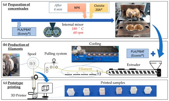 A schematic illustration of preparation of composites, production of filaments and 3D printing of the samples is shown in Figure 1. Concentrates were prepared in a Haake™ Rheomix 3000 (Thermo Fisher Scientific, Waltham, MA, USA) internal mixer fitted with roller-type rotors coupled to a torque rheometer operating at 180 °C and 60 rpm, for 8 min (Figure 1a). During processing, after the melting of Ecovio®, identified by the stabilization of torque after an average time of 4 min, NPK and bentonite clay were simultaneously added. Subsequently, the concentrates were diluted to obtain the filaments for 3D printing in an AX-16 (AX Plásticos, Diadema, SP, Brazil) single-screw extruder, with 16-millimeter screw diameter (L/D = 26), operating with a temperature profile of 150, 155 and 155 °C in its three heating zones and screw speed of 30 rpm (Figure 1b). Filament compositions are summarized in Table 1.