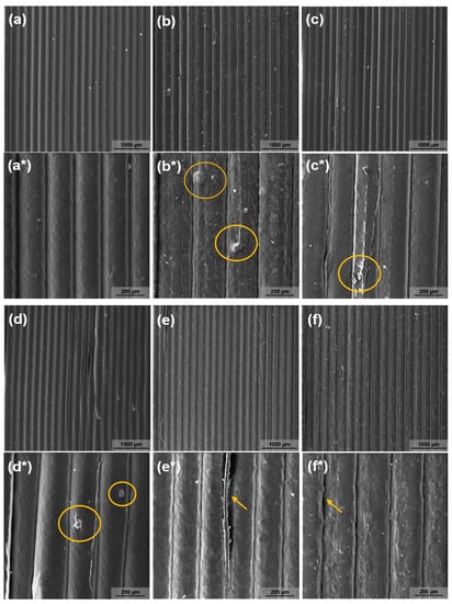 SEM micrographs of the external surface of a 3D printed sample for different compositions and magnifications: 50× [(a) Ecov, (b) Ecov/3NPK, (c) Ecov/3bent, (d) Ecov/6bent, (e) Ecov/3Bent/3NPK and (f) Ecov/6bent/3NPK]; 200× [(a*) Ecov, (b*) Ecov/3NPK, (c*) Ecov/3bent, (d*) Ecov/6bent, (e*) Ecov/3Bent/3NPK and (f*) Ecov/6bent/3NPK].