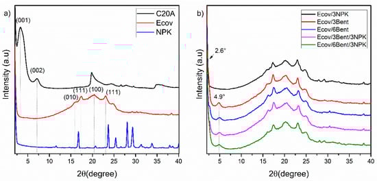 XRD of: (a) Cloisite 20A® (C20A), NPK and neat Ecovio® (Ecov); (b) XRD of: Ecov/3NPK, Ecov/3Bent, Ecov/6Bent, Ecov/3Bent/3NPK and Ecov/6Bent/3NPK.