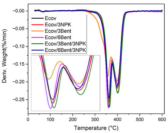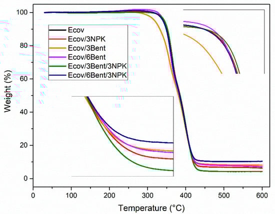 In our work, no significant variation in the thermal stability of the blend was observed for the other clay and/or fertilizer compositions (Ecov/3NPK, Ecov/6Bent, Ecov/3Bent/3NPK, Ecov/6Bent/3NPK), showing that there was no expressive variation in thermal stability compared to pure Ecovio®.