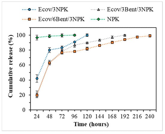 The average percentages of active compounds released by the filaments are shown in Figure 5. All systems exhibited considerable attenuation in the release of active compounds compared to free NPK. In up to 24 h of testing, the systems average cumulative release rate of NPK was, respectively, 21.00% and 19.67% for Ecov/3Bent/3NPK and Ecov/6Bent/3NPK. In this initial period, systems containing bentonite released about 22% less fertilizer than the Ecov/3NPK system. This difference is probably due to the higher concentration of nanoparticles that generate more barriers to the diffusion of NPK chemical species [62,63]. The Ecov/6Bent/3NPK system showed the greatest potential for release control with an average cumulative release rate of 81.85% after 120 h, while in the same period, the Ecov/3NPK system released 100% of the NPK.