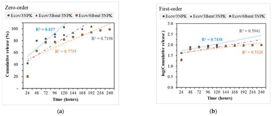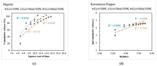 As previously shown in in Figure 5, the release profile of NPK from all the samples exhibited a pronounced initial release phase until 48 h of immersion time. This profile is probably due to burst release of fertilizer available in systems surface, which occurs immediately (because of NPK inorganic salts instantaneous dissolution in water), followed by a subsequent release governed by diffusive phenomena [34]. For Ecov/3NPK, a value of n = 0.52 and fast kinetics were observed compared to systems with organobentonite (Figure 6d). This value close to 0.5 indicates that kinetics of this system were mostly driven by diffusive phenomena. For Ecov/3Bent/3NPK and Ecov/6Bent/3NPK, after 48 h, the slope of the curves changed and exhibited a remarkable slower release rate. The release exponents for these systems were, respectively, n = 0.68 e n = 0.58, indicating that the kinetics were probably governed by diffusion and swelling phenomena associated with the barrier effect generated by organobentonite [34,70,71].