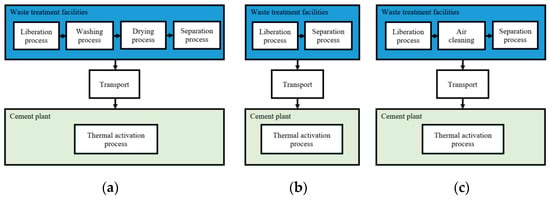 For the LCA of RCC, three production methods were considered, depending on the tasks required during the separation process, specifically the cleaning of the material prior to the magnetic separation. The background of RCC production was presented in Section 2 and a summary of the production details of the different methods is displayed in Figure 1.