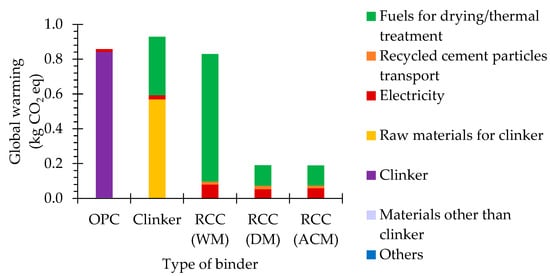 Nonetheless, the processing of the concrete waste to retrieve the recycled cement paste requires a substantial amount of electricity, and in RCC WM, also of fuel, which contributes to the global warming potential. In total, the global warming potential of RCC is about 22–92% of that of OPC, depending on the production method (Figure 3, Table 1). As RCC DM and RCC ACM require less electricity and, especially, less fuel, their global warming potential is only close to 23% of that of RCC WM (Figure 3, Table 1). The global warming potential of RCC ACM is similar to that of RCC DM (about 99%).