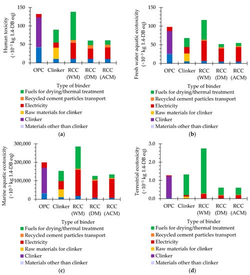 As previously observed for other impact categories, the human toxicity and freshwater aquatic, marine aquatic and terrestrial ecotoxicity potentials of OPC were mainly affected by its clinker content, which was primarily influenced by raw material, fuel consumption and, to a lesser extent, electricity consumption.