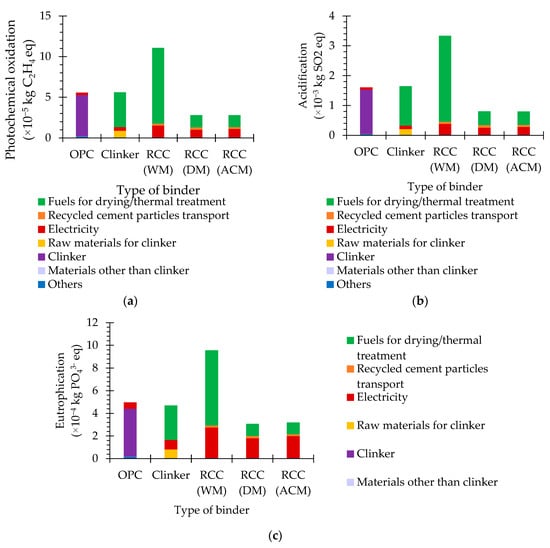Overall, depending on the separation method, the photochemical-oxidation, acidification and eutrophication potentials of RCC are about 50–199% (Figure 6a, Table 1), 50–208% (Figure 6b, Table 1) and 62–192% (Figure 6c, Table 1) of those of OPC, respectively.