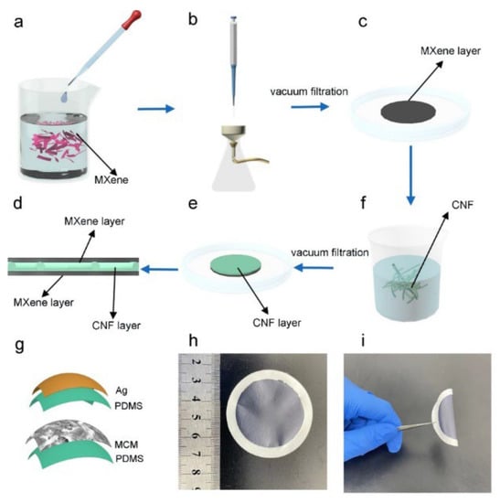 The CNFs (10–20 nm in diameter and 20–1000 nm in length) were purchased from North Century (Xuzhou, China) Cellulose Material Co., Ltd. The MXene thin film was self-assembled via vacuum-assisted filtration. Moreover, the multi-layer composite films such as MXene/CNFs and MCM films were fabricated through a layer-by-layer method. Finally, the as-prepared thin films were cured at 50 °C for 10 min to release the strain; thus, a flat composite electrode was obtained.