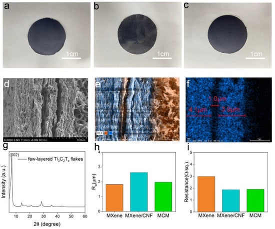 Figure 2. Characteristics of the MCM film. (ac) Photographs of MXene, MXene/CNF, and MCM films. (d) SEM image of the lateral section of MCM film. (e) The energy-dispersive spectrometer of MCM film. (f) The Ti element distribution in the MCM film. (g) The XRD pattern of few-layered MXene. (h) The surface roughness of MXene, MXene/CNF, and MCM films. (i) The sheet resistances of MXene, MXene/CNF, and MCM films.