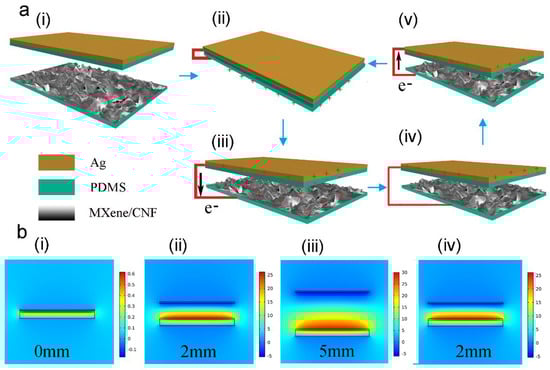 A clear understanding of the working mechanism of TENG can help us to improve its output performance. The charge distribution and electron transfer are illustrated in Figure 3a. In the initial state, the two triboelectric layers (MCM and PDMS film) were not in contact, and there were no triboelectric charges (i). Under compressive force, the MCM film and PDMS film were in full contact, leaving the triboelectric charge distributed on the surface (ii). As for releasing the compressive force, the potential difference drove the electron flow from the top electrode to the bottom electrode (iii). When the TENG returned to the initial state, the distance between the MCM film and the PDMS film reached the maximum value (iv). Next, when the MCM film approached the top electrode, the potential difference drove the electron transfer in the opposite direction (v). Finally, when the two triboelectric layers were in contact again, the opposite triboelectric charge was recombined. Moreover, there was no potential difference between the two electrodes. The cyclic contact and separation will result in AC output. Figure 3a schematically illustrates the short-circuit current of TENG, and the finite element analysis of the open-circuit voltage of TENG was conducted, as shown in Figure 3b. In the fully contact state (d = 0 mm), there was nearly no potential difference between the two electrodes (i). When the distance increased to 2 mm, the potential difference increased to ≈30 V (ii). As the distance reached the maximum value, the potential difference also reached the maximum value of ≈35 V (iii). When the distance decreased to 2 mm again, the potential difference decreased to ≈30 V (iv). The open-circuit voltage was proportional to the distance. Thus, the measured maximum voltage will occur when two triboelectric layers are fully separated. Conversely, the measured maximum current occurs between fully contact and the initial state. In addition, the switching polarity test of the TENG was conducted, as shown in Figure S2 in the Supplementary Materials.