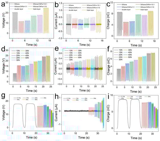 Figure 4. Output electrical performance of TENG. (a) Open-circuit voltage, (b) output current, and (c) transferred charges of TENG based on various bottom electrodes. The relationship between (d) open-circuit voltage, (e) output current, (f) transferred charges of various TENG, and the compressive force. The effect of working frequency on the (g) open-circuit voltage, (h) output current, and (i) transferred charges.
