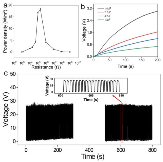 Powering capacity is another parameter used to assess the electrical performance of TENG. The output power density of MCM-TENG is shown in Figure 5a. The MCM-TENG was working under a force of 500 N with a frequency of 1 Hz. Moreover, the relationship between the output voltage and the load resistance is displayed in Figure S3. The power density increased as load resistance increased from 1 to 0.2 MΩ, and then decreased as load resistance further increased to 1 GΩ. The maximum power density was 18.4 W/m2 at the optimum resistance of 0.2 MΩ, which is efficient to power micro-nano devices. Furthermore, the as-obtained MCM-TENG was used to charge commercial capacitors of 1 μF, 2.2 μF, 4.7 μF, and 10 μF. The charging curves are displayed in Figure 5b. The capacitor of 1 μF can be charged to 3 V in 200 s. Apparently, the charging rate was inversely proportional to the capacitance. In addition, the stability test was conducted, as shown in Figure 5c. The MCM-TENG was measured under a force of 50 N and a frequency of 2 Hz. It can be seen that the output voltage was stable after about 2000 cycles. It demonstrated a long service time, which is important for practical applications.