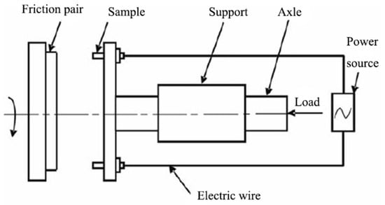 The surface microhardness of the coating was measured using HVS-1000 Vickers microhardness with a load of 2 N and the holding time of 10 s, and the average microhardness was calculated from 5 test points. The tribological property of the samples was investigated using a high-speed loading MMS-1.5GZ wear tester, as shown in Figure 1. The pin was made of the test materials, and the counter plate was made of 52,100 steel (HRC61). The sliding speed was in the range of 70–110 m/s with a sliding time of 300 s, a load of 50 N, and the loaded current was 0 or 20 A. In the previous work, ZrB2-ZrC, which reinforced copper matrix composite coatings, was successfully prepared by laser cladding [19], and the wear resistance of the coating was tested under low-speed reciprocating friction conditions. In this work, the high-speed, current-carrying wear resistance of ZrB2-SiC reinforced the copper matrix composite coating and was tested and analyzed in detail.