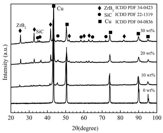 The phase analysis of the composite coating was carried out by XRD, and the obtained results are shown in Figure 5. Cu (PDF 04-0836), ZrB2 (PDF 34-0423), and SiC (PDF 22-1319) were detected in the laser cladding composite coating. Cu was the matrix phase of the composites, and both ZrB2 and SiC were in-situ synthesized reinforcement phases. No raw materials (Zr, Si and B4C) or additional phases were found. The results showed that the in-situ reinforcements were successfully formed in the molten pool over laser cladding. The synthesis reaction was completed, and no impurity phase was formed. This was in agreement with previous thermodynamic calculations. In addition, the diffraction peaks of ZrB2 and SiC were enhanced with the increase of the reactants content (from 10 wt% to 30 wt%).