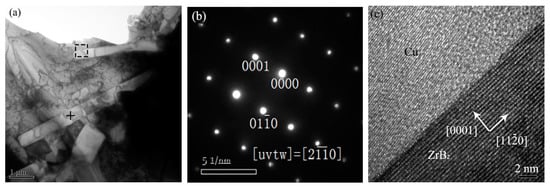 As shown in Figure 9a, under the high laser energy density (of 66.67 kJ/cm2), small-sized ZrB2s with a diameter of about 500 nm and a length of more than 5 μm could be observed. The electron diffraction spots of the marked needle-like phase are shown in Figure 9b, where the needle-like phase was determined to be ZrB2 by measuring and labeling. The interface of reinforcements and the matrix was an important microstructure within the composites. Figure 9c shows the high-resolution TEM of the interface of ZrB2 and Cu. It was identified that ZrB2 and Cu were directly bound together without defects and other phases at the interface, indicating that the in-situ synthesized ZrB2 formed an excellent bond with the copper matrix. After measurement and calibration, the directions [0001] and [110] of ZrB2 were determined as shown by the arrows.