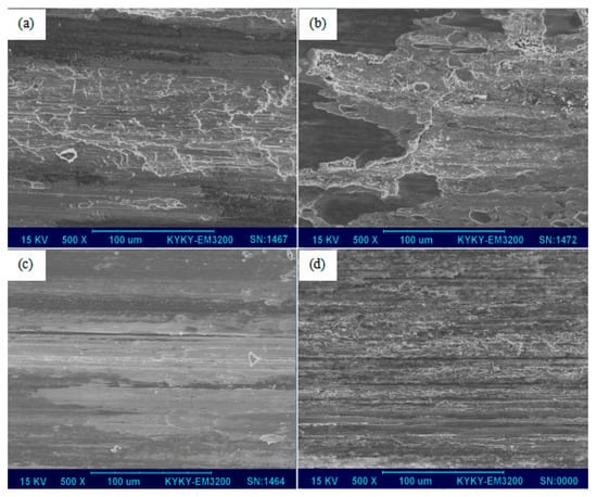 The wear surface topography is shown in Figure 13, where Figure 13a,c shows the wear surface topography at the reinforcement phase content of 15, 25 wt% without a current. It could be observed that the surface of the coating with a 15% reinforcement was rugged and surface peeling in most of the surface area occurred at this time. The surface was flat for a composite with reinforcement at 25%, and shallow and long furrow scratches began to appear. The main reason for the above phenomenon was that when the content of the reinforced phase was lower (15%), the surface hardness of the coating was also lower, and a large amount of heat was generated in the friction process to soften the material surface. During the wear, the surface’s coating was seriously damaged by the opposite grinding plate, so the surface wear was serious and showed serious adhesive wear. When the content of the reinforced phase was higher (25%), surface hardness was also increased, strips of wear debris were deposited on the surface, and wear surface topography tended to level off into abrasive wear. The wear rate decreased with the increase of the reinforcement content, and the wear mechanism changed from adhesive wear to abrasive wear.