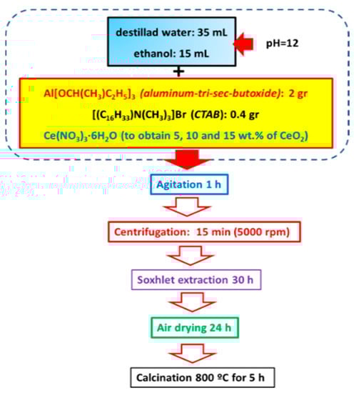 The γ-Al2O3 was synthesized by the sol-gel method following the method by Zhou et al. [47]. In a standard Al2O3 support synthesis, 0.4 g of cetyltrimethylammonium bromide (CTAB, Sigma-Aldrich ≥ 98%, St. Louis, MO, USA) was dissolved in 35 mL of deionized water under stirring. The pH value of 12 was obtained by adding NH4OH (28–30%, A.C.S. Reagent, J.T. Baker, Santa María Ecatepec, Oaxaca, Mexico). Subsequently, the second solution was prepared by adding, under stirring, 2 g of aluminum tri-sec-butoxide (Al(OC4H9)3; Sigma-Aldrich, 97%, St. Louis, MO, USA) to 15 mL of ethanol. This solution was added dropwise into the surfactant solution under continuous stirring at room temperature for 1 h. After that, the solid was separated by centrifugation (5000 rps) and Soxhlet extraction for 30 h. Next, the as-obtained solid was dried in air at room temperature for 12 h and then treated with He at 800 °C for 5 h to remove the organic template. Synthesis of Al2O3-CeO2 (briefly denoted as Al-Ce(x)) with different ceria loadings (5, 10, and 15 wt.%) was in the same manner as it has been mentioned before for the alumina calcined at 800 °C but adding the solution of an appropriate amount of cerium nitrate (Ce(NO3)3·6H2O, 99%, Sigma-Aldrich, St. Louis, MO, USA) dissolved in cetyltrimethylammonium bromide and deionized water. Once the gelation of supports was completed, the solids were dried in air at room temperature overnight and calcined in static air at 800 °C for 5 h. Figure 1 shows a schematic representation of the preparation of the Al2O3-CeO2 materials.