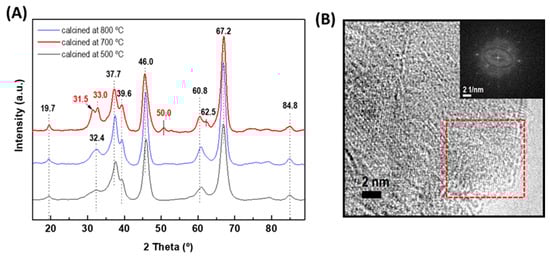 As stated in the introduction part, among the different types of alumina, γ-Al2O3 is the most widely used support for HDS catalysts. Although the γ-alumina phase could be progressively degraded into α-alumina by heating it at a high temperature, the temperature used for the HDS reaction is much lower than that of its transformation into the α-alumina form (approximately 1000 °C) [15]. Considering that the crystallographic properties of alumina support strongly depend on the temperature of their calcination, pristine alumina was calcined at 500, 700, and 800 °C to select the best calcination temperature for the formation of the γ-Al2O3 phase (Figure 2A). As expected, the XRD pattern of alumina precursors treated at 500 °C and 700 °C showed peaks at 2θ = 19.7° (very small), 32.4°, 37.7°, 39.6°, 46.0°, 60.8°, and 66.2° (very intense) corresponding to γ-Al2O3 (JCPDS 86-1410). An increase in temperature from 700 °C to 800 °C led to the splitting of the very broad peak of 32.4° into two peaks (31.5° and 33.0°) and a new peak appeared at 2θ of 50.0°. All these peaks belong to the γ-Al2O3 phase (JCPDS 00-001-1304). At 800 °C, the transformation of γ-Al2O3 to α-Al2O3 did not occur because such a transformation takes place at a temperature much higher than 1100 °C [50]. Therefore, the temperature of 800 °C was selected for the Al2O3-CeO2 support calcination. Figure 2B shows the HRTEM image of the γ-alumina calcined at 800 °C. The fast Fourier transform (FFT) image corresponds to the marked area confirming the formation of γ-alumina.