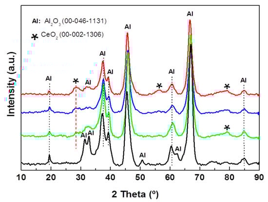 X-ray diffraction patterns of pristine Al-Ce(x) supports with different CeO2 loadings (x = 0, 5, 10, and 15 wt.%).