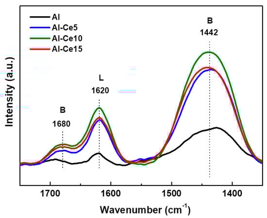 The changes in the alumina acidity after modification with varying amounts of CeO2 were investigated by the DRIFT spectra of NH3 adsorption at 120 °C [23]. Figure 4 shows the DRIFTS-NH3 spectra of all supports synthetized with the sol-gel method. The bands at 1680 and 1442 cm−1 are due to the δsym(H---N---H) and δasym(H---N---H) vibrations of NH4+ ions of Brønsted acid sites of the surface, respectively, while the band at 1620 cm−1 is commonly attributed to Lewis acid sites [51]. In addition, the observed shadow of approximately 1500 cm−1 can be attributed to the bending mode of the surface of the NH2 species [52]. Considering the integrated areas of the Brønsted and Lewis bands (data not shown here), both acidities increased after the modification of alumina with CeO2. As a consequence, all Ce-containing supports showed a higher Brønsted/Lewis acidity ratio than pure γ-Al2O3.
