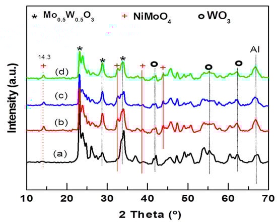 XRD patterns of all NiMoW/Al-Ce(x) calcined catalysts also exhibit peaks at 2θ = 14.29°, 32.58°, 38.7°, and 43.87° corresponding to the (110), (022), (−132), and (330) planes of crystalline nickel molybdenum oxide (NiMoO4; JCDPS 000-033-0948). The diffraction peaks at 23.6°, 33.64°, 41.46°, 54.57°, and 60.25° in 2θ correspond to the (200), (220), (222), (420), and (422) planes, respectively, of the crystalline WoO3 phase (JCDPS 00-046-1096). In addition, all calcined catalysts show the peaks characteristic of the Mo0.5W0.5O0.3 phase (JCPDS 00-028-0667). For the Al-Ce(x) supported catalysts, the intensity of the NiMoO4 peaks increased while those of the WO3 and Mo0.5W0.5O0.3 phases decreased with respect to the same peaks observed in the Ce-free sample pattern. The decrease in the peaks corresponds to the WO3 and Mo0.5W0.5O0.3 phases, with increasing CeO2 content, suggesting that the modification of the alumina with CeO2 improves the dispersion of these phases.