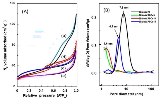 The effect of CeO2 loading on the textural properties of the synthesized catalysts was evaluated from the N2 adsorption-desorption isotherms (Figure 6A). Considering the IUPAC classification, the adsorption branch of the NiMoW/Al sample is of type IV, which is typical of mesoporous materials. Its hysteresis loop is a combination of H1 and H3 types: the H1-type is typical of mesoporous materials that have nearly cylindrical uniform channels, while the H3-type is characteristic of macroporous materials that have not completely filled pores with pore condensate [53]. On the other hand, the NiMoW/Al-Ce15 catalyst presents an adsorption isotherm with a type IV shape. Its hysteresis loop belongs to the H3 type. It has already been shown [53] that hysteresis appears when an adsorbent has slit-shaped pores. It is noteworthy that the decay of its desorption branch is in a narrow P/P0 range and its hysteresis loop starts at a lower relative pressure than that of the sample without Ce, indicating the presence of smaller mesopores. The increase in N2 volume observed at a relative pressure above 0.8 is due to a capillary condensation phenomenon. Finally, in contrast to NiMoW/Al and NiMoW/Al-Ce15 catalysts, NiMoW/Al-Ce5 and NiMoW/Al-10 samples show a type II Langmuir isotherm associated with nonporous or macroporous adsorbents [53]. It should be noted that, unlike Ce-free catalysts and NiMoW/Al-Ce15, these catalysts do not possess any hysteresis loop.