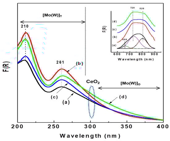 Information on the coordination environment of Ni2+ and Mo6+(W6+) ions in the calcined catalysts was obtained from UV-vis diffuse reflectance spectroscopy. Figure 7 shows the electronic spectra in the 200–400 nm region of all calcined catalysts plotted as a Kubelka–Munk–Schuster function, while the entry in this figure shows their 600–900 nm region. In the 200–400 nm region, all catalysts show two strong bands at approximately 210 and 261 nm, indicating the presence of ligand-metal charge transfer (LMCT); the band at 210 nm is due to the octahedral and/or tetrahedral coordinated Mo(W)6+ ions, while the band at approximately 261 nm is assigned to tetrahedral Mo(W)6+ species (Td) [13]. Considering the intensity of the latter band, the number of tetrahedral Mo(W)6+ species follows the trend Al-Ce5 > Al-Ce15 > Al-Ce10 > Al. As expected, all Ce-containing oxide precursors exhibit a shadow at approximately 300 nm due to O2− → Ce4+ charge transfer [41,54]. Considering the intensity of this shadow, the amount of CeO2 species follows the trend Al-Ce15 > Al-Ce5 > Al-Ce10. Moreover, all catalysts show a large tail between 300 and 400 nm, indicating the presence of octahedrally coordinated Mo(W)6+. It is noteworthy that the NiMoW/Al-Ce15 catalyst shows the highest intensity of the absorption band at approximately 325 nm, suggesting that this catalyst might have the highest number of octahedral species among the catalysts studied.