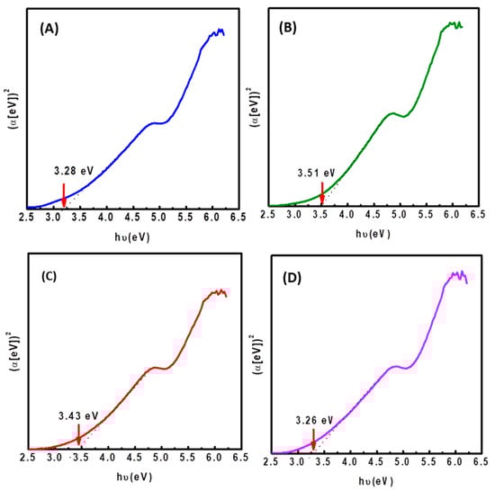 where α, h, υ, and Eg are the absorbance, Planck constant, photon frequency, photonic bandgap, respectively. The parameter n was assumed to be 2 (indirect electronic transition).