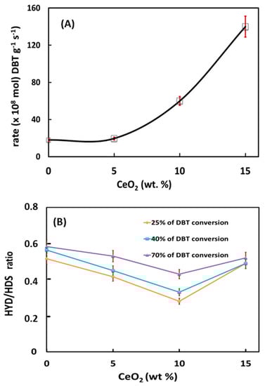 Figure 9A presents the initial reaction rates of DBT HDS over sulfided NiMoW/Al and NiMoW/Al-Ce(x) catalysts. As can be seen in this figure, the catalyst activity increases gradually as a function of Ce loading in the catalysts, reaching a maximum activity for the catalyst with the highest amount of CeO2 (15 wt.%).