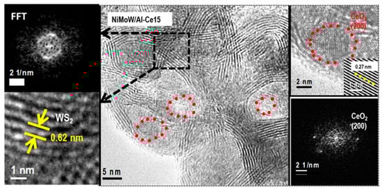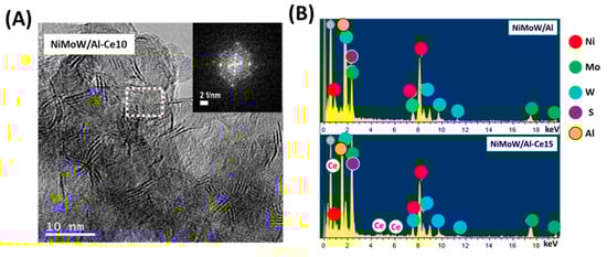 With regard to the active phases, it is well known that Mo(W)S2 clusters exhibit a layered structure of Mo(W) atoms located in trigonal prismatic coordination, whereas Ni(Co)-promoted Mo(W)S2 layers can be viewed as hexagonally truncated triangles [60]. As can be seen in Figure 10, Figure 11 and Figure 12, all catalysts show the basal plane of the Mo(W)S2 layers located parallel to the support surface. As expected, all catalysts show typical fringes corresponding to the (002) plane of the MoS2 (0.616 nm) and WS2 (0.618 nm) phases. For NiMoW/Al-Ce15, the appearance of the (200) planes of CeO2 (dspacing = 0.27 nm, JCPDS 01-075-0390) confirmed the presence of small CeO2 crystallites on the surface of the alumina support (Figure 12). The presence of the Ce element on the surface of this catalyst was also confirmed by EDS measurements (Figure 11B).