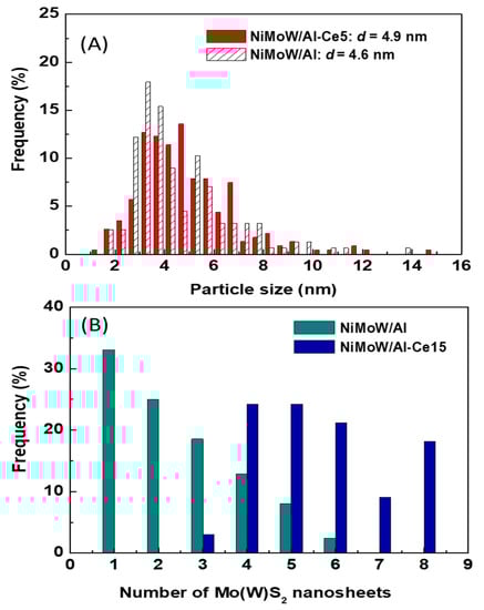 For the Ce-free and NiMoW/Al-Ce10 catalysts, statistical evaluation of the Mo(W)S2 particle length from various HRTEM images suggests a similar average size of Mo(W)S2 nanoparticles (approximately 5 nm) (Figure 13A). Compared to these catalysts, NiMoW/Al-Ce15 shows much larger curved Mo(W)S2 sheets with radii of curvature ranging from 1 to 6 nm (Figure 12). To avoid underestimation, no attempt was made to obtain the average particle size of this catalyst. In the case of NiMoW/Al-Ce15, the formation of the onion-shaped Mo(W)S2 layers might be induced by the CeO2 location along the (002) direction of the Mo(W)S2 crystallites. The dislocation of the coplanarity of MoS2 planes as a result of the intercalation of Ni atoms in the MoS2 interlayer space was reported for unsupported NiMoW catalysts [61]. However, in the case of NiMoW/Al-Ce15, the Ni promoter is probably located at the edge sites of the Mo(W)S2 layers, forming “NiMo(W)S” phases. Similar onion-shaped structures were previously observed for NiMo catalysts supported on Ti-modified HMS [8]. The presence of CeO2 NPs on the NiMoW/Al-Ce15 surface favors the high stacking of Mo(W)S2 layers, as deduced from the comparison of TEM images of the used catalysts in Figure 10.