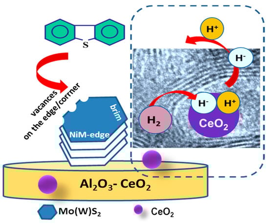 Schematic representation of the DBT HDS reaction mechanism on the surface of the best NiMoW/Al-Ce15 catalyst showing the adsorption of DBT on the CUS sites of the NiMo(W)S phase and the mechanism of the heterolytic dissociation of H2 on CeO2 nanoparticles.