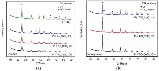 XRD of the catalysts Pt/TiO2 and Pt/TiO2-CeO2: (a) Sol-gel and (b) Impregnation.
