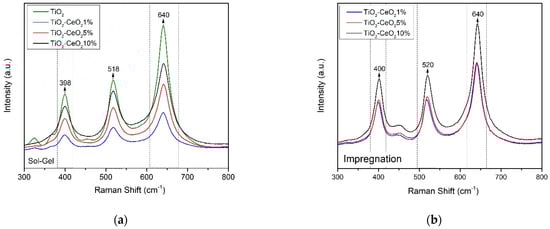 On the other hand, as seen in Figure 2, in the Raman spectra of the TiO2 supports and the mixed oxides TiO2-CeO2, which were prepared by the sol-gel and impregnation method, peaks corresponding to the anatase phase 398–400, 518–520, and 640 cm−1 are observed. Observing a slight Raman shift, which means that CeO2 has been integrated into the structure of the TiO2 support. It is assumed that the ≡ Ti-O-Ti ≡ bonds of the corresponding TiO2 network of the anatase phase are disturbed by the presence of cerium oxide, which suggests some substitutions of the Ti4+ by Ce4+ that form ≡ Ti-O-Ce ≡ bonds in the structure of titanium oxide.
