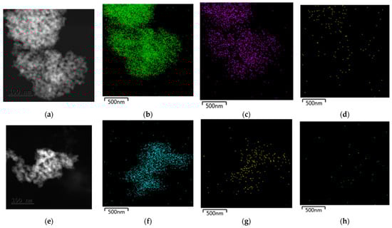 Transmission electron microscopy images of the Pt/TiO2-CeO2 10%: (a) Sol-gel to 100 nm scale, (b) Sol-gel take α of the Ti, (c) Sol-Gel take α of the Ce, (d) Sol-Gel take α of the Pt, (e) Impregnation to 100 nm scale, (f) Impregnation take α of the Ti, (g) Impregnation take α of the Ce, and (h) Impregnation take α of the Pt.