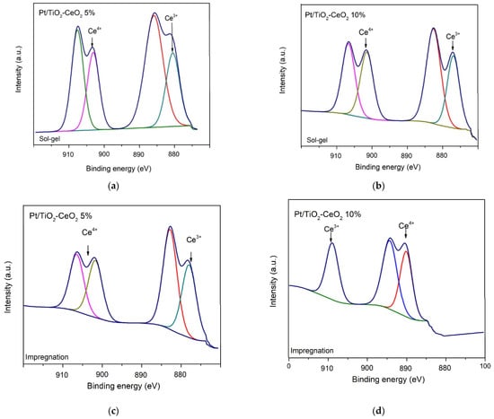 Table 2 reports the binding energies for TiO2, which can have values ranging between 457.7–458.1 eV [27], as shown in Figure 6, which indicates that there was no modification due to the doping effect with the CeO2 content, nor with the preparation method of the Pt supports. The binding energy was also determined for the Ce 3d5/2 level (Table 2 and Figure 6); it was found in the region of 870–920 eV [28]. Relative abundance calculated from these XPS spectra showed that Ce4+ (oxidized) species increased with increasing CeO2 content relative to Ce3+ (reduced). Coinciding with Rocha et al. (2015), it is possible to observe that at a lower concentration of CeO2, a greater number of atoms in the Ce3+ oxidation state will be obtained.