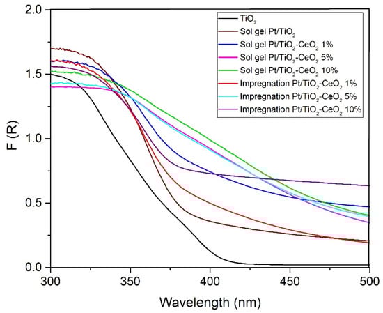 The photophysical properties UV–Vis absorption spectra of the catalysts were evaluated to investigate the effect of CeO2 on the support network. Figure 6 shows the spectra of UV–Vis materials by diffuse reflectance for sol-gel and impregnation methods. All samples have a shift between these wavelengths, which can be attributed to the transitions of the Ti-O electrons of the TiO2 and TiO2-CeO2 nanocrystals.