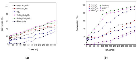The photocatalytic degradation of 2,4-D in the absence of support or catalyst had a conversion of 32% while the maximum conversion reached was 95% and 97% for the Pt/TiO2-CeO2 1% and Pt/TiO2-CeO2 catalysts 5% prepared by the sol-gel method (Figure 7B), and the catalysts prepared by the impregnation method reached a maximum of 62% conversion. On the other hand, the supports prepared by impregnation reached a maximum of 49% TiO2 while those prepared by the sol-gel method reached up to 61% (Figure 7A). The highest yield achieved in the catalysts prepared by sol-gel Pt/TiO2-CeO2 1% and Pt/TiO2-CeO2 5% could be attributed to an optimal concentration of CeO2, which allows the insertion within the CeO2 of the TiO2 and leads to the deformation of the lattice, modifying the mobility of the oxygen atoms and favoring the oxidation-reduction process [26]. In contrast, the results of XPS in the Pt/TiO2-CeO2 1% and Pt/TiO2-CeO2 5% catalysts showed that the proportion of oxidized species of Pt 2+ and Ce 4+ are essential to function as oxygen scavengers, which are important in oxidation-reduction processes. Additionally, the smallest particle size in the catalysts prepared with the supports by sol-gel was in a range of 2 to 6 nm. This is due to a greater specific area due to a good integration of CeO2, which favors a better dispersion of the metallic nanoparticles on the surface of the supports, favoring the catalytic activity in the degradation of 2,4-D.