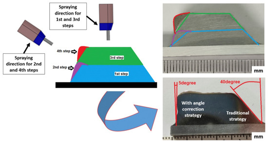 The traditional strategy used in CS for powder deposition is based on a linear and normal movement of the CS gun with respect to the substrate surface, which might repeat for depositing consecutive layers, or alternating this direction, as presented by arrows in Figure 1. This extended deposition strategy promotes the growth of CSAM part sidewalls off-normal angle with the substrate surface, which limits the use of CSAM to near-net-shape components production that should finally be post-machined until the desired geometry and dimensions are obtained. The inclination shown by CSAM part sidewalls usually leads to more or less slope depending on the material sprayed, CS spraying parameters, or the substrate geometry, such as spraying on its flat surface or edges. The literature presents some approaches to developing a suitable deposition strategy for CSAM. For instance, some authors have proposed that it is possible to compensate this inclination in consecutive spraying tests, making the particles laden jet perpendicular to this inclined surface [32,33,34], Figure 2. Here, it is mandatory to know the inclination angle of the growth sidewall and redress the geometry at the end. However, this strategy is not feasible when thin walls are intended. In addition, the modification of the spraying directions generates new interfaces in which the cohesion of the particles is weaker, promoting an inhomogeneity of final component properties.