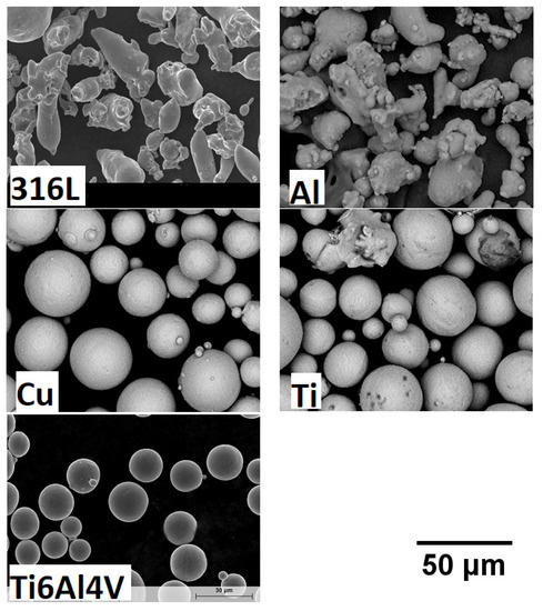 The five feedstock powders for CSAM have the shapes obtained by SEM presented in Figure 3, where it is possible to see the typical irregular shape for the water-atomized ones, 316L and Al, as well as the spherical gas-atomized Ti alloys and pure Cu. The powder size distribution is also presented in Figure 4, which is quite similar for all the powders and is in the range optimal for CS processes because particles out of this range may not reach the optimal velocity at the impact on the substrate [35,36].