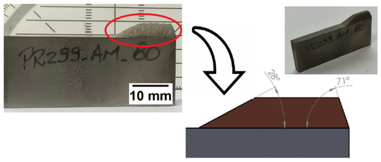 A comparison between the CSAM 316L bulks produced by traditional and Metal Knitting strategies is presented in Figure 9, which also shows the real bulk part obtained. Identical deposits were CSAM fabricated with Ti and Ti6Al4V alloy powders with successful results. Visual inspection showed that none of the bulk parts produced (316L, Ti, and Ti6Al4V) presented any cracks or detachments from the substrate. In addition, the parts made by Metal Knitting showed smoother surfaces and more rounded edges compared to the rough finishing and sharp edges seen in the CSAM part produced by the traditional spraying strategy. In this sense, using the Metal Knitting strategy on the substrate’s flat surface, CSAM 316L, Ti, and Ti6Al4V components showed a sidewall angle of around 80 degrees to the substrate surface. It is a significantly smaller inclination value than the inclination produced by the traditional strategy on a flat surface, as shown in Figure 9.