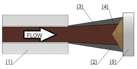 Scheme of CS particles laden jet. (1) Nozzle, (2) sparse particles and lower velocity particles laden jet, (3) concentrated particles and high-velocity particles laden jet, (4) sprayed material, (5) flat substrate.