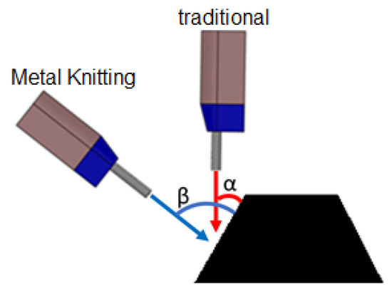 Scheme of the angle of impact of particles on an inclined surface by traditional (α) and Metal Knitting (β) strategies.