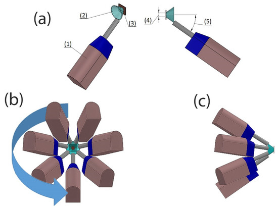 Metal Knitting strategy scheme. (a) (1) CS gun, (2) virtual frustum of cone path, (3) substrate, (4) radius, (5) angle. (b,c) simulation of different directions of view of CS gun describing the Metal Knitting movements.