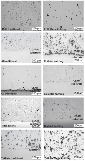 CSAM parts or any material obtained by CS have properties influenced by the cold-working, resulting from the severe plastic deformation under the material’s recrystallization temperature. This increases the density of dislocations in the metal’s crystalline structure and consequently improves the properties of the sprayed feedstock material. Figure 10 presents the as-sprayed CSAM microstructures obtained by Metal Knitting and traditional strategies, which is in consonance with observations in the literature. There is a trend of higher density for the most ductile sprayed materials, Al and Cu, while harder materials resulted in a higher porosity, as seen for Ti6Al4V. This has influences on the material’s properties, as summarized in Table 4. For the CSAM samples made by the traditional strategy, the microstructures, hardness, and porosity obtained were close to those presented in the literature for 316L [10,13,14,51], Al [21,23,24], Cu [16,17,21,52,53], and Ti alloys [19,20,21]; however, for Metal Knitting the literature did not present any result, because it is a brand-new strategy.