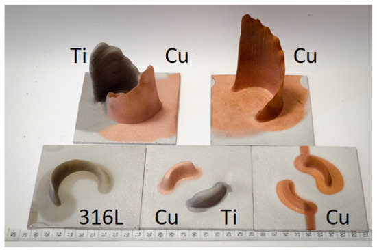 The Metal Knitting was changed from a straight line based path to a curved lines based path, keeping the cone-like movements; following these non-straight lines, the production of curved walls was feasible, as presented in Figure 13. Different materials were tested, 316L, Ti, and Cu. A change in the robot program made it possible to grow multi-material close walls, Ti and Cu, on the same Al plate substrate.