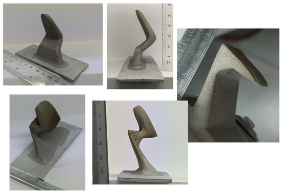 The CSAM Metal Knitting strategy was also evaluated for more complex geometries, which were feasible by controlling the growth direction. Figure 14 presents CSAM 316L parts. For the left and right images of Figure 14, the spraying started in a direction non-perpendicular to the substrate, indicating a good adhesion because no cracks or delamination were observed after visual inspection. The changes in growing angle and direction were performed by the inclination of the substrate holder, making this activity easier because a change in the robot program for each of these geometries would demand much time and effort to make a unique part. However, a robot program can guarantee the dimensional quality requirements for mass production, or at least dozens of components.