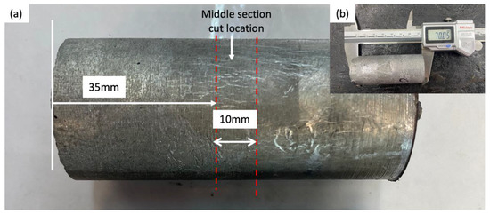 Whole sectional macrographs of thixoformed A356 aluminium matrix composite component reinforced by 0.3 wt.% GNPs (a) sample cut location; (b) whole length of billet composite (about 70 mm).